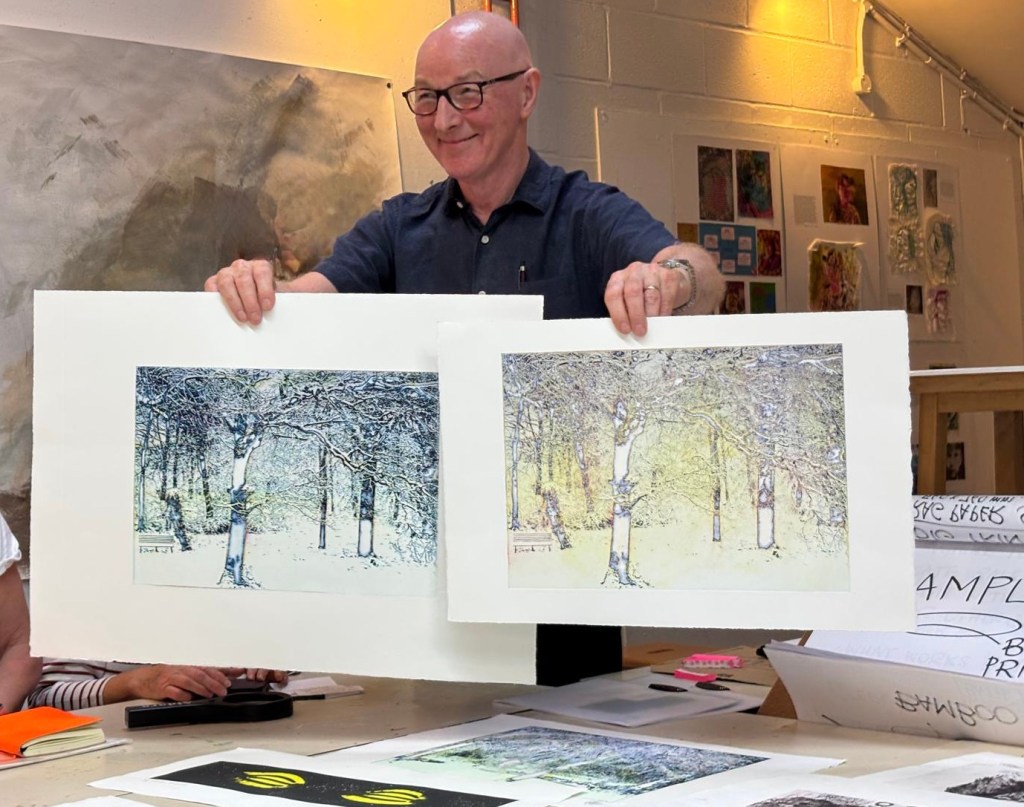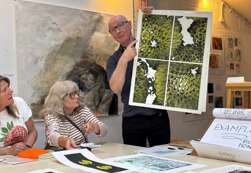Our member Barry Gowers gave a fascinating talk on his intricate solar plate processes and practice. We were privileged to see a fab selection of his wonderful and varied prints, including successful submissions to the RA’s Summer Exhibition. It was a really inspirational evening, thoroughly enjoyed by all, and we’ve finally persuaded him to be part of our upcoming winter exhibition – definitely a win for Cowprint!