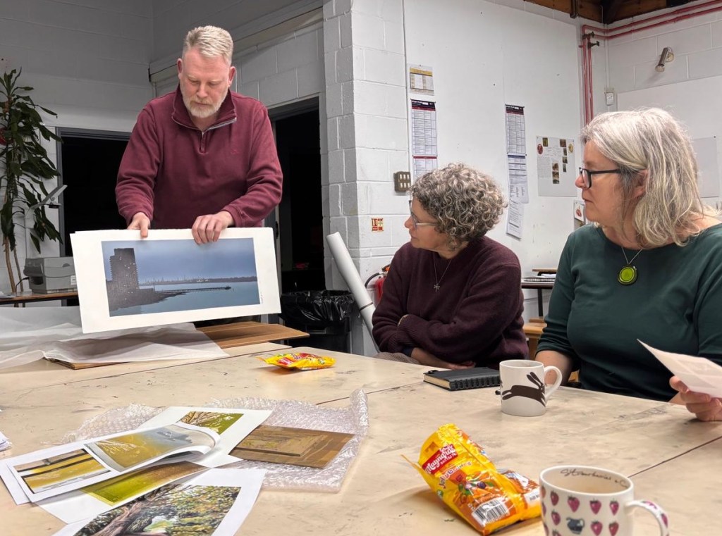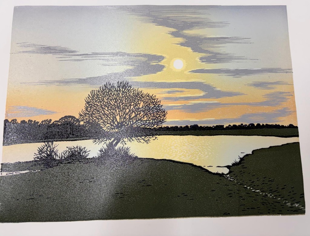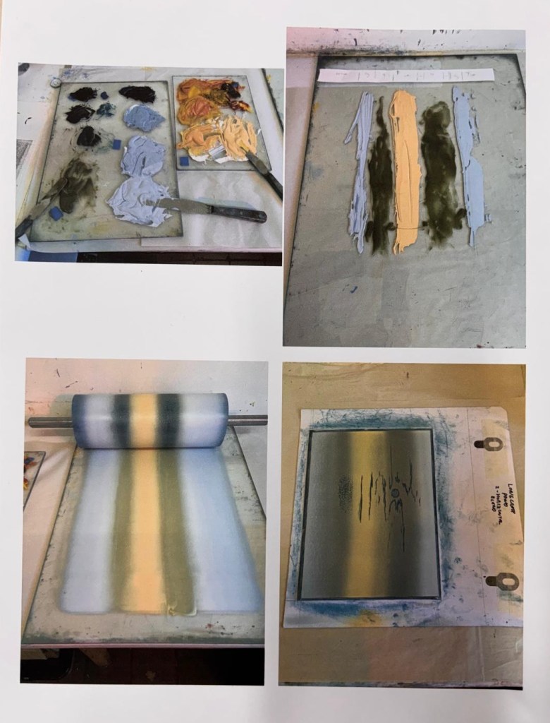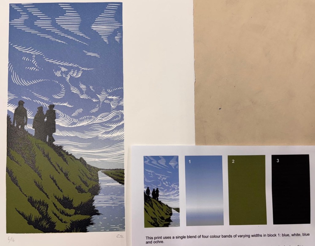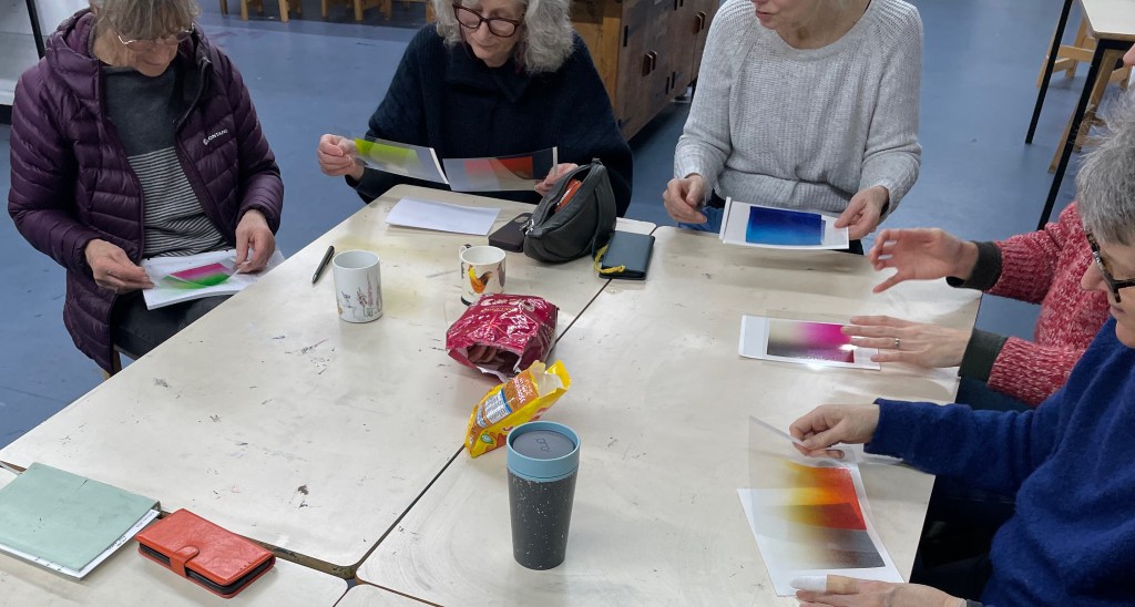 Our member Eddie Curtis is a fan of colour blends (or colour rolls) and uses them extensively in his work. At our February meeting, Eddie shared his experience and ideas on how blends can be used to build up images as well as adding depth and interest. His tips and tricks for rolling reliable blends were really helpful for members – experienced and beginners. And he brought along some inked up acetates in a range of shades – great fun was had playing with colour combinations and how they might work as blends.