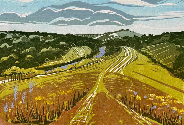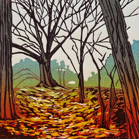 I love walking with my dog Chewbacca and my family and friends. I am inspired by nature and the landscape around me when I walk. I sometime sketch whilst en plain air or I will take photos and work up images in the studio afterwards. I will typically paint a scene in acrylic paint before designing a linoprint plate of the same or a similar image. The size and/or shape of the acrylic painting may differ from the linoprint, but I find the process of acrylic painting helps me develop ideas and colours for the linoprint. I find this is most effective for me when creating a reduction linoprint and when considering layers and colours to build up to the make the final image.
