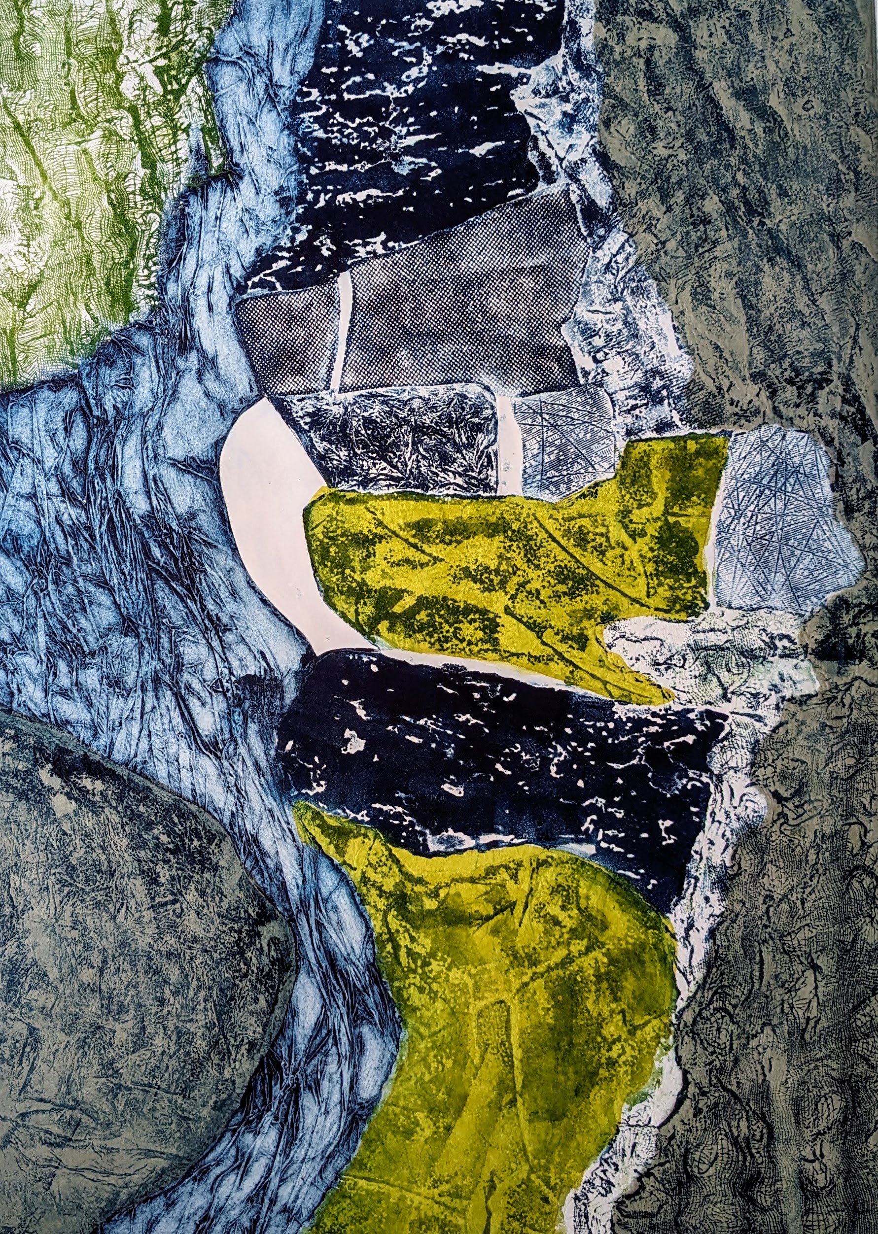 I soon discovered there were many techniques and possibilities and became utterly hooked, leading to weekly printing at Bodenpress. I have practised collagraph, reduction lino, screenprint, monoprint, monoprint-screenprint, and copper etching.