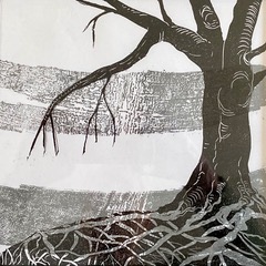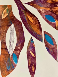 ‘I’m currently experimenting with different papers, textures & printing from found objects – such as feathers or pieces of fallen tree bark. Collagraphy lends itself well to this, as did printing direct from tree bark with linocut in my Love Trees project. I love the way this brings nature more directly into the picture’.
