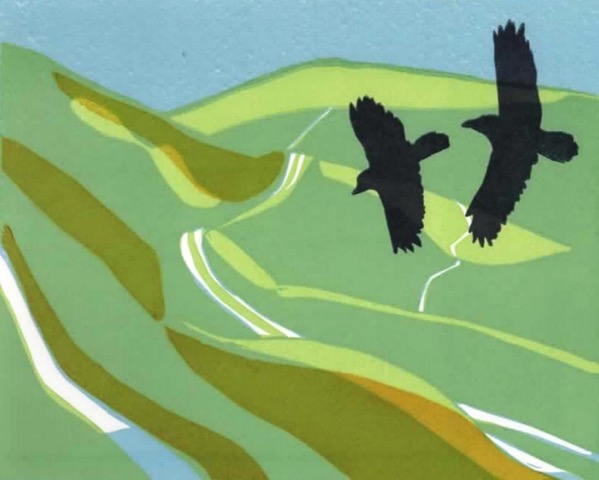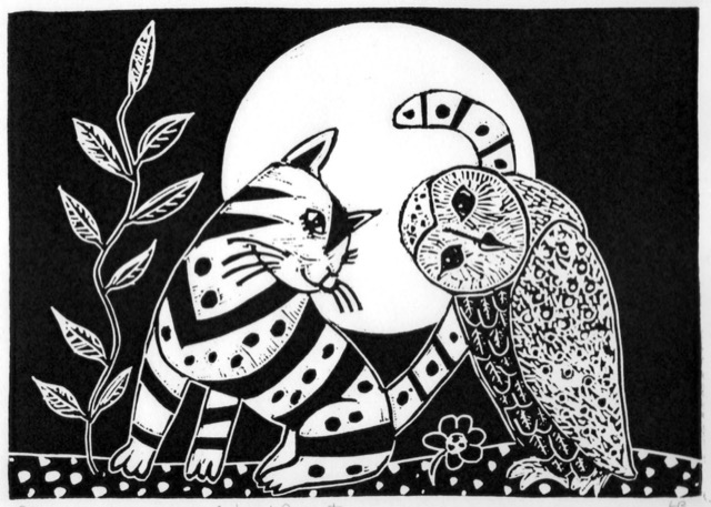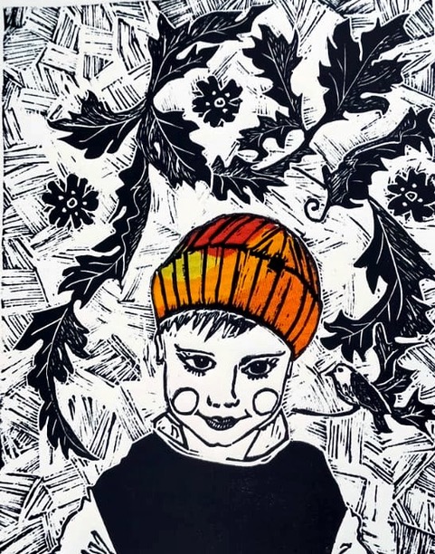 Linda has had lifelong preoccupations; love of the natural world and traditional fairy tales, myths and legends. The inspiration for Linda’s prints comes from her interest in Folk Art. Children’s relationship with animals and love of birds feature strongly. The folk art inspired work has been created using linocut